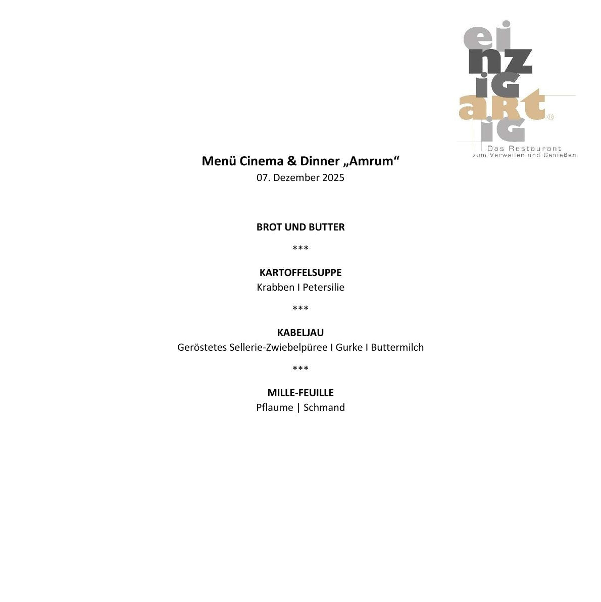 Wir begrüßen Sie im SCALA-Programmkino (Apothekenstraße 17) mit einem Aperitif und zeigen Ihnen den Film "Amrum", nach dem gleichnamigen Roman von Hark Bohm. Amrum erzählt voll wilder Schönheit davon, was Herkunft bedeutet - und wie man lernt, den eigenen Weg zu gehen. Nach der Vorstellung geht es in unser Restaurant einzigartig. Dort erwartet Sie ein 3-Gang-Menü.